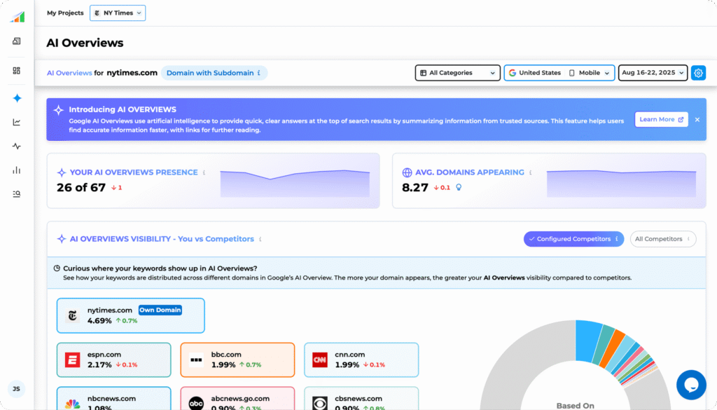 - Google AI Overviews Analysis Monitor how your website appears in Google’s AI-generated overview sections and track visibility trends over time.