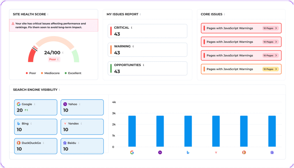 - Automated SEO Audits Run comprehensive, automated audits of your website to identify technical SEO issues, content gaps, and optimization opportunities — no manual effort needed.