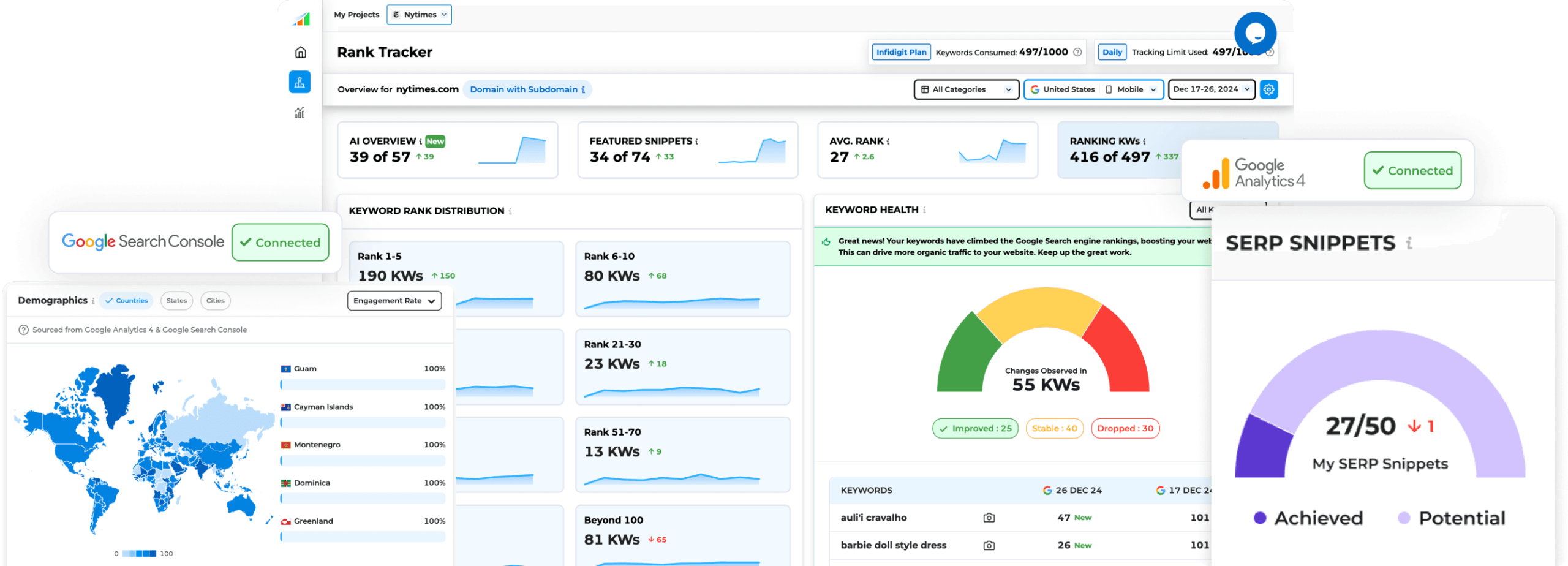 Infigrowth’s Daily Rank Tracker Tool stands out for its comprehensive international coverage, offering businesses the ability to track keyword rankings globally. With our platform, users can zero in on specific regions to manage international SEO campaigns across countries effectively. From understanding local SERP features to gaining competitive insights and optimizing strategies, our extensive keyword data set explores keywords in 100+ countries and 5,000+ cities. For large-scale operations, our enterprise rank tracking solution delivers even deeper insights, ideal for businesses managing high-volume keyword portfolios across multiple markets.