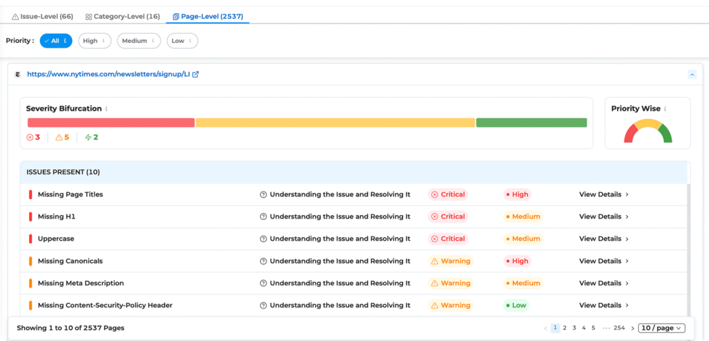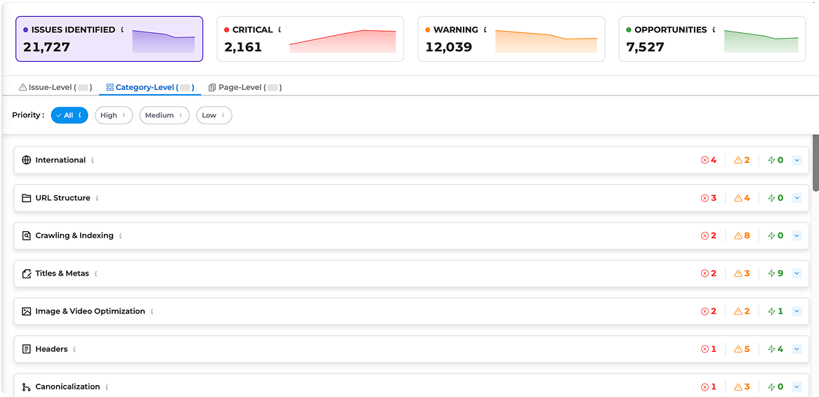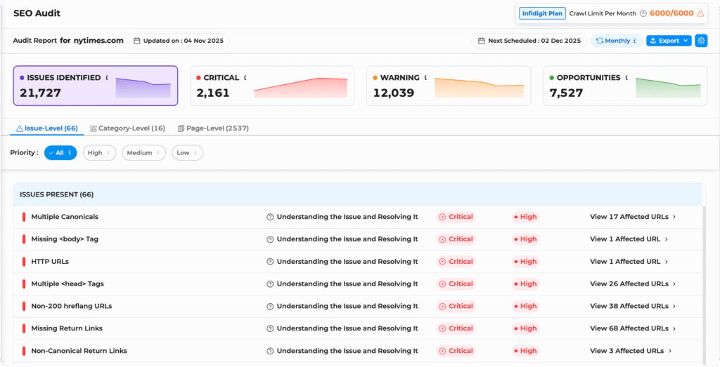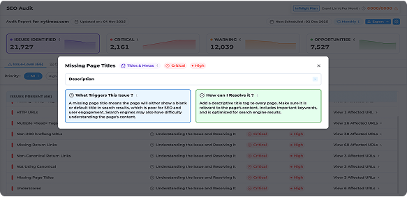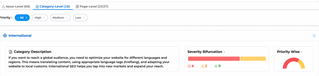 The AI in Infigrowth’s SEO audit tool prioritizes SEO issues by analyzing their impact on site performance, search rankings, and user experience. It categorizes them into high, medium, and low priority, ensuring that the most critical problems are addressed first for optimal results.